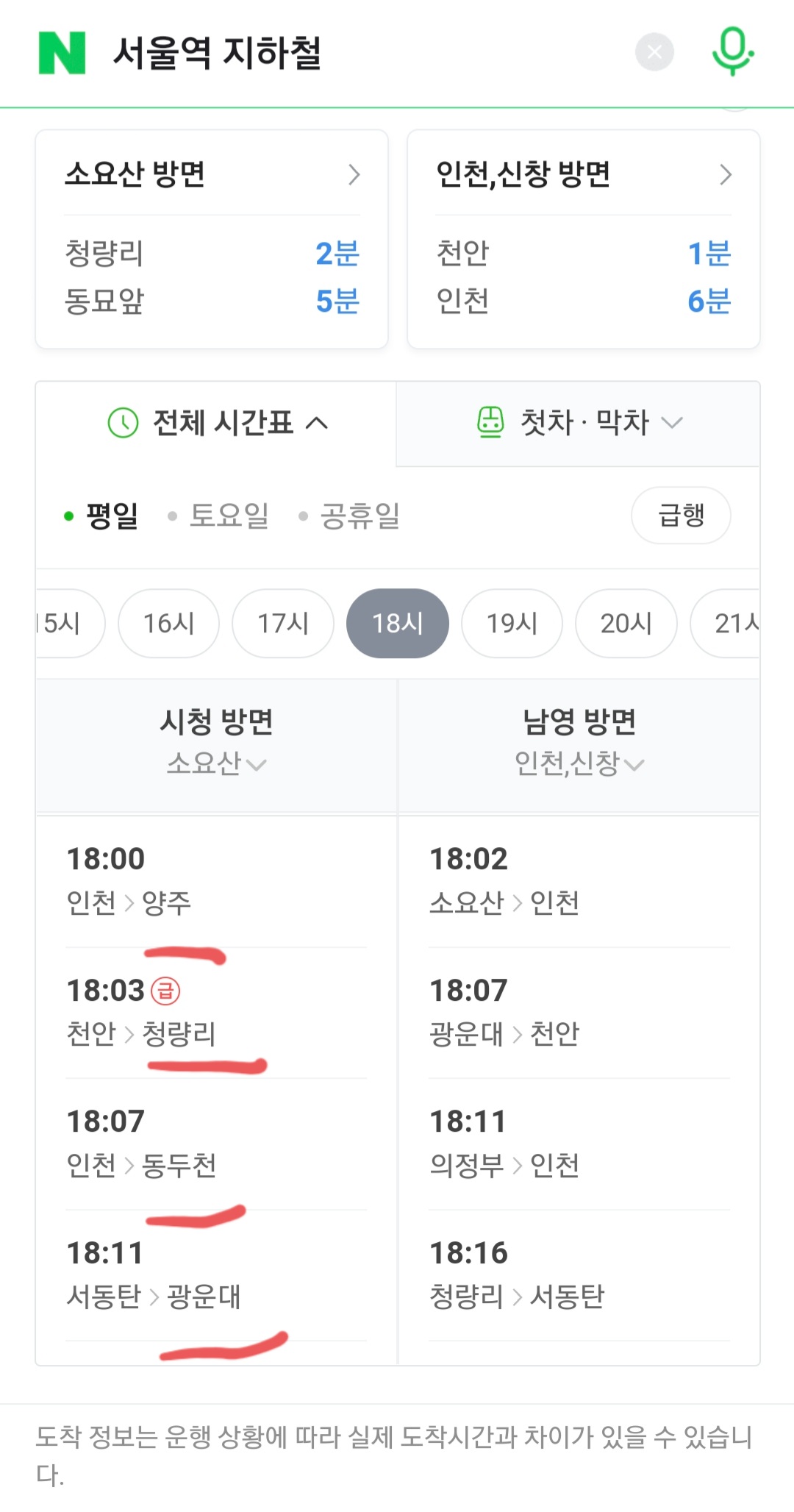 사진을 보면 출발도 다르지만, 도착역을 잘 보자.
